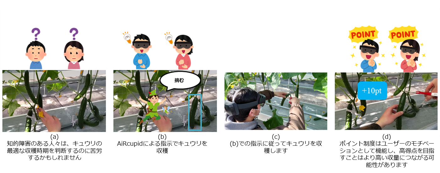 D. Inoue, K. Naito, P. Buayai and X. Mao, “AiRcupid: Supporting Cucumber Picking for Intellectual Disabilities using Artificial Intelligence and Augmented Reality,” in 2023 IEEE International Symposium on Mixed and Augmented Reality Adjunct (ISMAR-Adjunct), Sydney, Australia, 2023 pp. 289-295, doi: https://doi.org/10.1109/ISMAR-Adjunct60411.2023.00065.