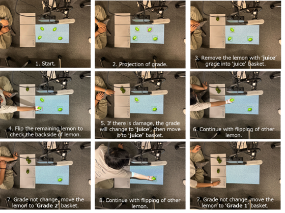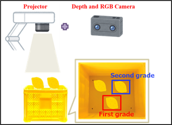 To enhance the quality of agricultural products and improve productivity while reducing manual labor for farmers, an automated lemon grading program has been proposed. This program utilizes advanced imaging technology, incorporating an Intel RealSense camera mounted on a flat surface, accompanied by a small projector to ensure accuracy and efficiency in assessing lemon quality. When a lemon is placed under the grading panel, the system’s model automatically detects and classifies each lemon based on its size, color, and quality. Upon determining the grade of the lemon, the system projects a bounding box directly onto the lemon to visually display its grade, providing immediate and clear feedback to the farmer.