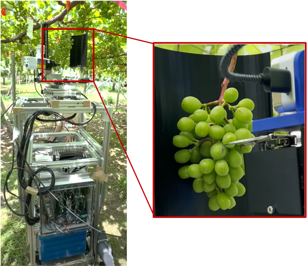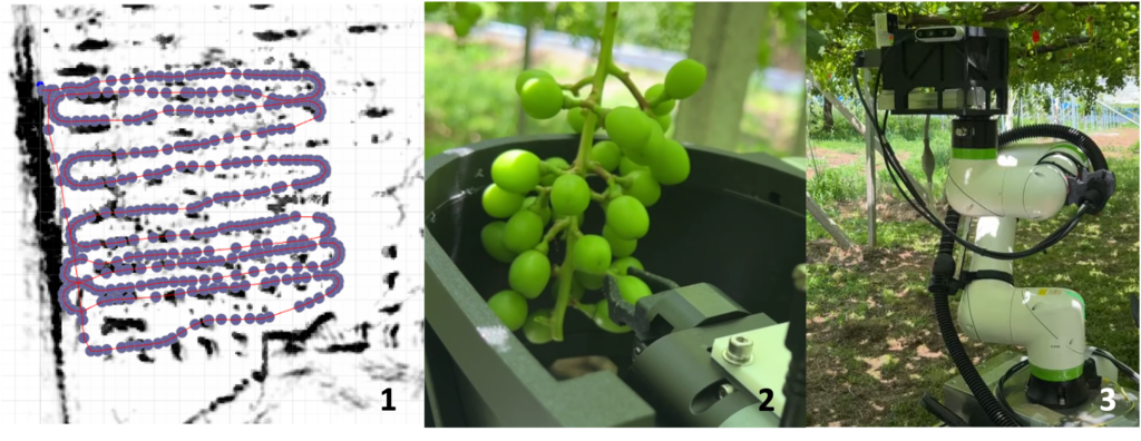 本システムでは、事前にブドウ園のマップを登録し、目に見える果房もしくは隠れている果房の位置情報をあらかじめ記録する。これに基づき、ロボットは自動的に経路設計を行い、果房を一房ずつ順番に摘粒する。ロボットが摘粒対象の果房付近まで到達すると、ロボットは停止し摘粒作業を開始する。ロボットアームに搭載されたエンドエフェクタには2台の深度カメラが組み込まれており、1台は最も近い果房の検出に、もう1台は摘粒作業の誘導に用いられる、FANUCアームは、経路設計機能により対象果房へ近づく。さらに、専用設計のカバーによって果房を中央に誘導・保持し、摘粒中の後方移動や揺れを防ぐ。