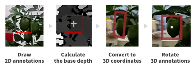 - Convert 2D annotations to 3D coordinates using the base depth information.