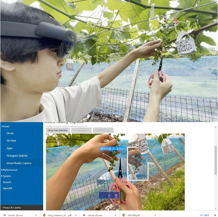ぶどう栽培における房づくりは、作業適期が限られており、ぶどうの品質を左右する重要な行程である。従来までは、熟練者の経験と技術が多く必要とされてきた。そこで本研究は、AIを活用したスマートグラス型支援システムにより、ぶどう栽培における房づくり作業の負担軽減を目的とする。