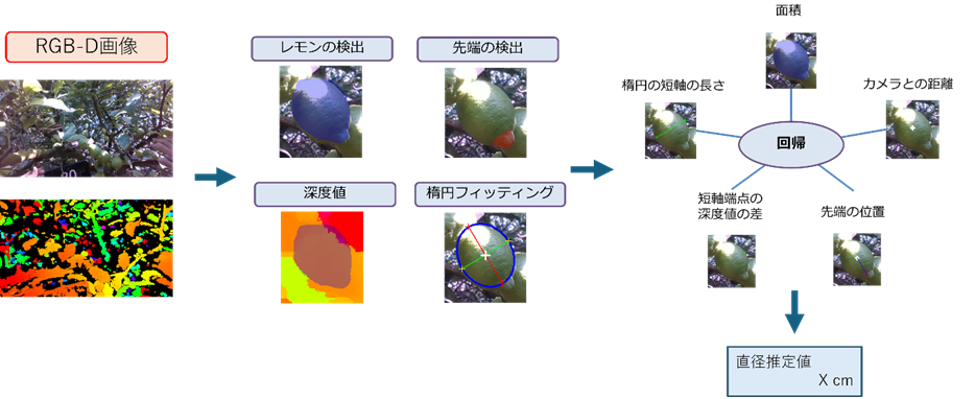 レモンの収穫作業において,収穫基準の1つにレモンのサイズがあり,サイズ規格はレモンの断面の直径の長さにより定められている.現在収穫は最小出荷規格の直径の長さを持つ金属製リングをレモンに通し,通過するかどうかで収穫の判断を行っている.このリングの使用により発生する問題が2つ挙げられる.1つ目はリングがレモンに擦れることにより表面に傷がつき,品質の低下につながることである.2つ目は目視で収穫判断ができない全てのレモンに対してリングを通すため,作業負担が大きいことである.本研究では,RGB-DカメラでRGB画像と深度画像の2枚を利用して,Deep Neural Network (DNN)の技法によって画像からレモンの領域を検出し,その後の処理によって取得したレモンの特徴から回帰手法にてレモンのサイズとして直径の長さを推定している.