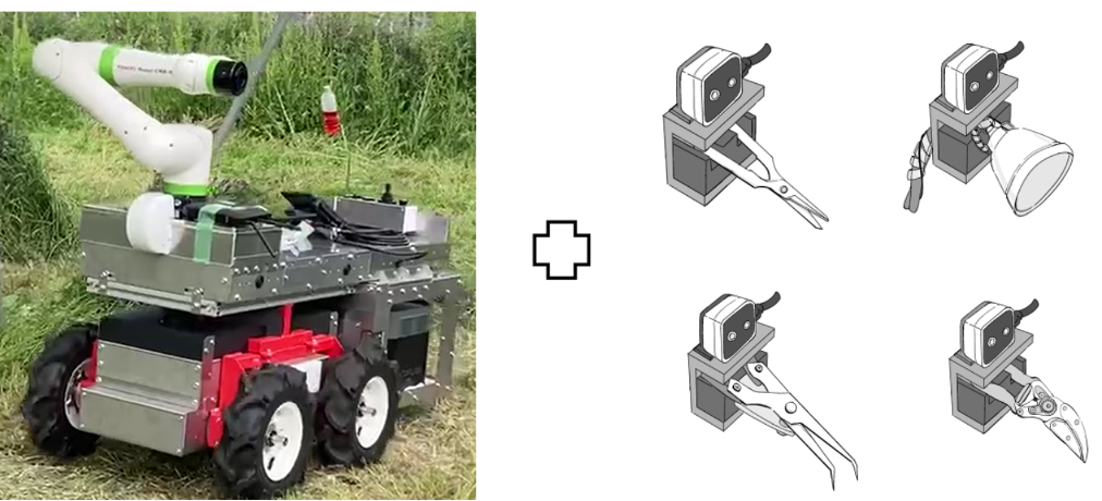 図3: (左) REACT移動ロボットに搭載されたFANUC協働ロボットアーム, (右) カッターのバリエーション