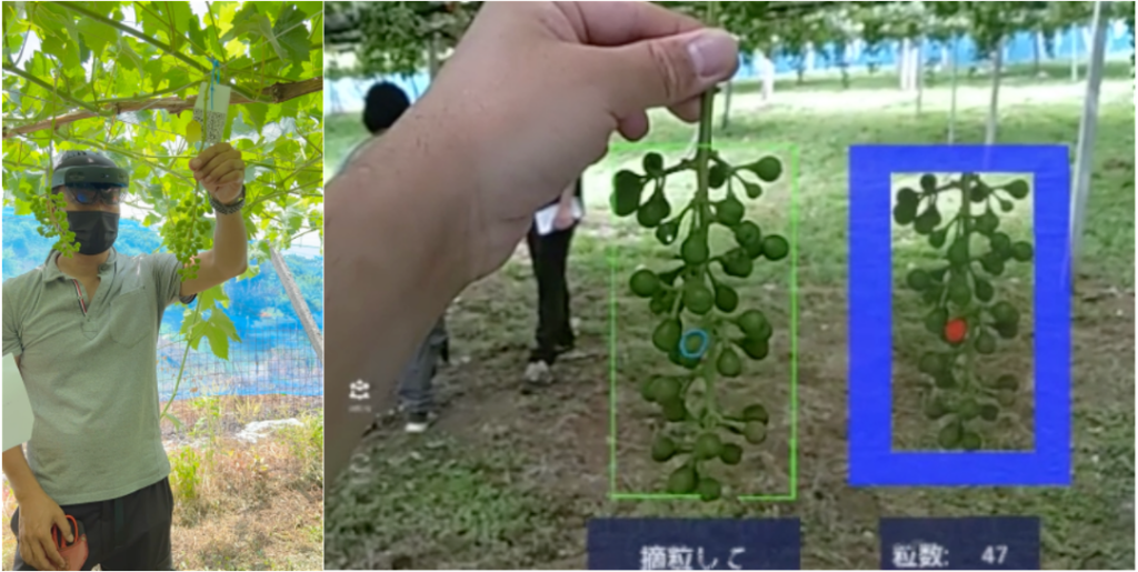 使用方法として、作業者はスマートグラスを装着し、ぶどうの房を緑色のガイド枠内に配置するものである。ぶどうを認識すると、AIにより粒数が自動的に推定される。なお、その誤差は±1%以内である。また、摘粒対象の判定精度は95%以上を達成している。図1の右側の青い枠内に示すように、摘粒すべき粒は赤色で強調表示される。さらに、正しい摘粒が行われた際には、点滅による視覚的フィードバックが与えられ、推定された果粒数が枠の下部に表示される。次に摘粒すべき粒は逐一ハイライトされガイダンスが提示される。